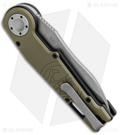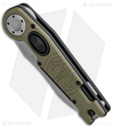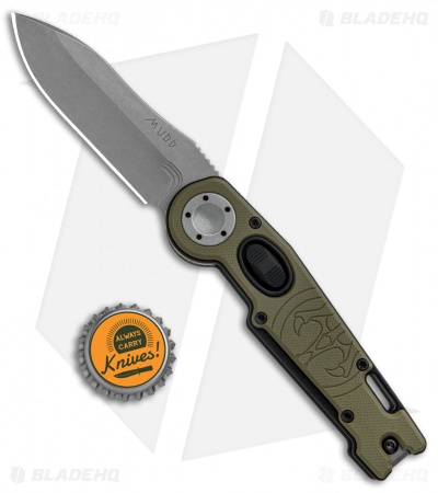 This M.U.D.D. prototype model offers an automatic upgrade to the M.U.D.D. design with an OD green G-10 handle and a stonewashed blade.
