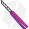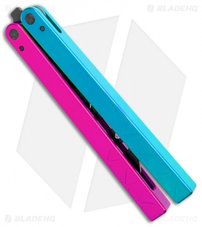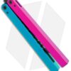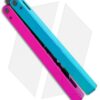 This Cotton Candy balisong trainer features a black blade and a pink handle and a blue handle.