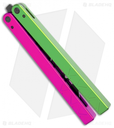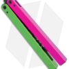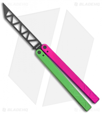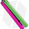 This Watermelon balisong trainer features a black blade and a pink and a green handle.