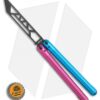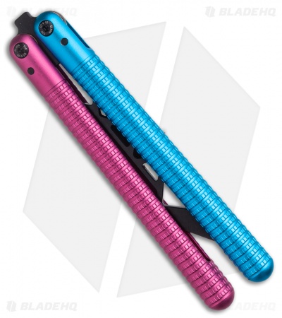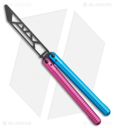 This SAHARA balisong trainer features a black blade and cotton candy like, blue and pink handles.
