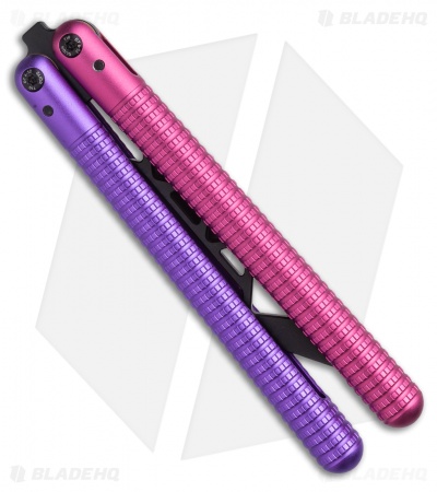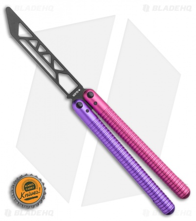 This SAHARA balisong trainer features a black blade and Milky Way, pink and purple handles.