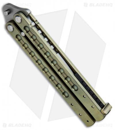 This custom balisong from Groniger Knives is a hefty butterfly knife with a sturdy, performance ready build. A handmade design ensures the highest level of quality for all Groniger knives. This model is outfitted with green anodized titanium handles, black G-10 spacers, and a bead blasted CPM-S30V blade with a compound grind.