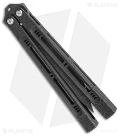 This Heibel Knives Menace Balisong Knife is a mid-tech from Blade Show East 2022! It has a modified tanto blade made of black stonewashed RWL-34 and has black titanium handles.