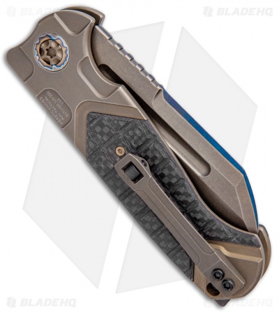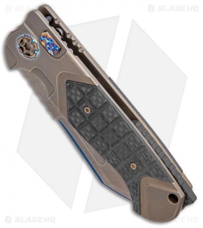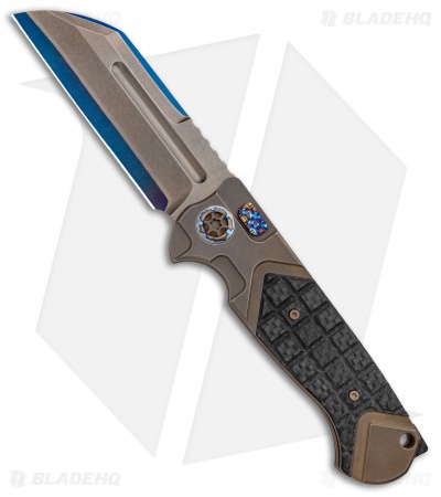 ADV and Heretic Knives have teamed up to offer you a fantastic fully automatic version of the Andre de Villiers Butcher. This model is built with a bronze/blue San Mai blade and a bronze anodized titanium handle with frag carbon fiber scales and flamed titanium hardware. Item includes a tip-up roller ball clip.