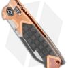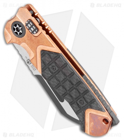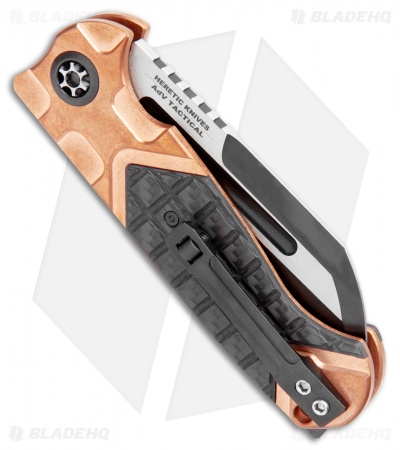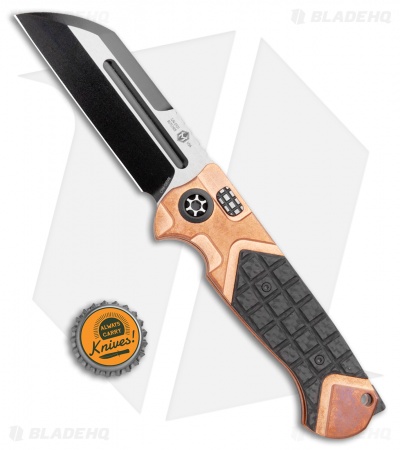 ADV and Heretic Knives have teamed up to offer you a fantastic fully automatic version of the Andre De Villiers Butcher. This model is built with a battleworn black two-tone sheepsfoot blade and a copper handle with frag carbon fiber scales. Item includes a tip-up roller ball clip.
