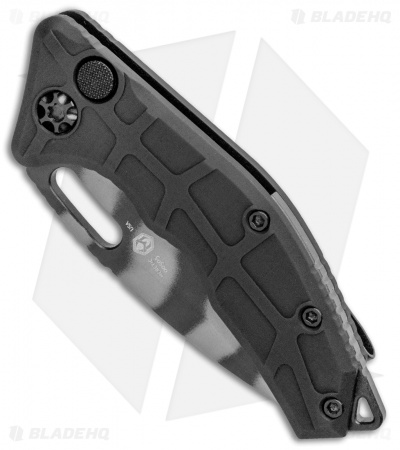 This Martyr Auto model features a tiger striped tanto blade made from CPM-S35VN stainless steel. It has a black aluminum handle with a black pocket clip, backspacer, and hardware.