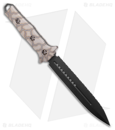 - Black finely serrated dagger blade made from ELMAX super steel.