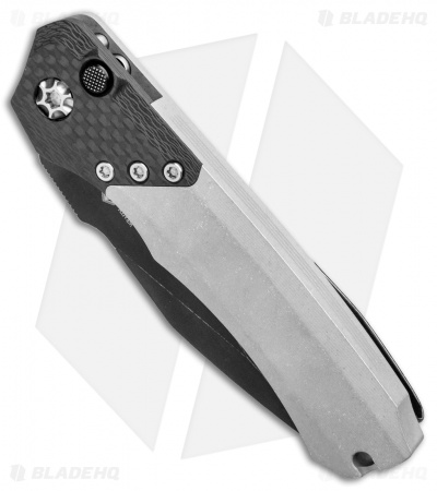 This Wraith automatic model features a black finished blade made from 154CM stainless steel. It has a single piece aluminum handle in a Battleworn finish and a carbon fiber bolster.