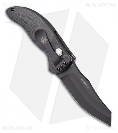This EX-04 Automatic model has a 3.5″ Wharncliffe style blade and Black/Gray G-Mascus handle.