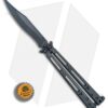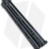 This Basilisk Elite production model features black PVD coated titanium handles with a skeletonized hole design and horizontal jimping. It has a bowie style blade with a recurve edge and a black coating to match the handles. The knife comes outfitted with PVD coated hardware, spacers, and latch.