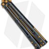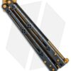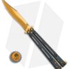 This Basilisk Elite production model features black PVD coated titanium handles with a skeletonized hole design and horizontal jimping. It has a bowie style blade with a recurve edge and a gold titanium nitride coating. The knife comes outfitted with matching gold TiN coated hardware, spacers, and latch.