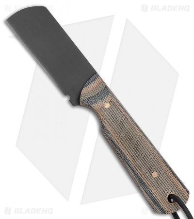 - Camo micarta handle scales over a full tang with brass pins.