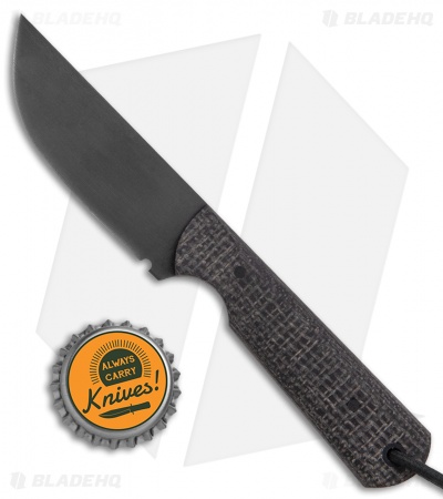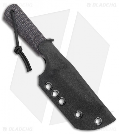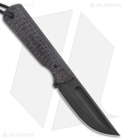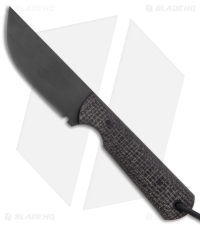 - Black burlap micarta handle scales held to a full tang with black pins.