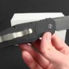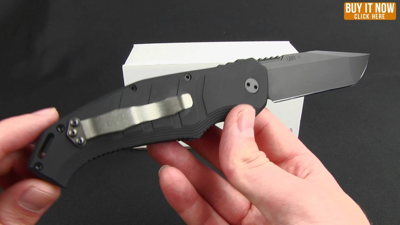 The Atrox is a large, heavy duty automatic knife. The name Atrox means savage or fierce, and it’s also the Latin species classification of the Western Diamondback Rattlesnake. The Atrox has subtle serpent-like styling cues. It has a beefy 6061-T6 aluminum handle and carbon fiber pocket clip. The tanto style blade is black coated with polished satin flats.