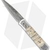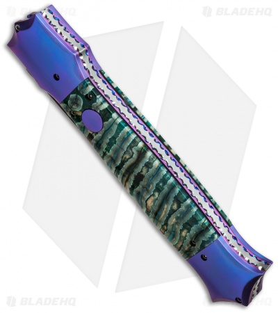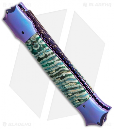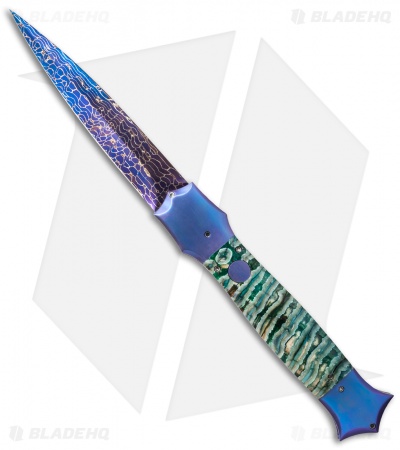 This custom Large Shiv Dagger was handmade by Kyle Vallotton and makes the perfect collection knife. It has a Chad Nichols “Scrambled Egg” pattern Damascus steel blade and blued bolsters. The dagger blade is hollow ground and has a single sharpened edge. Green and tan colored mammoth molar handle scales have a impressive appearance and are set atop a titanium liner lock frame. The liners and polished stainless steel back spacer have been filed, adding to the overall feel and appearance of this fine knife. This knife includes a signed certificate of authenticity from the maker.