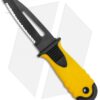 - Spear point blade made from black coated D2 steel with a serrated edge.