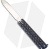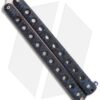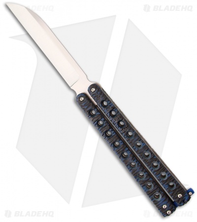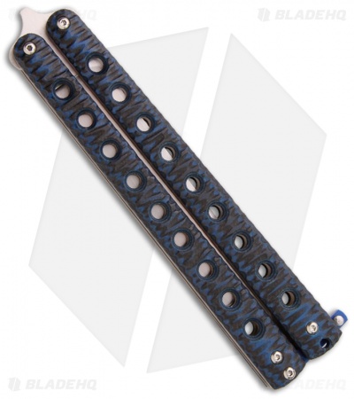 This McAhron butterfly knife has skeletonized handles with file-textured blue/black G-10 over titanium liners. The pivots have silicon bronze bushings and washers that perform well and keep handle play to a minimum. Zen pins are utilized along with stainless spacers and a blue G10 roller style latch. The Sheepsfoot style blade is hand rubbed satin CPM-154 steel with a hollow grind and features a rolled spine and short tang ears.