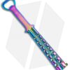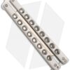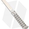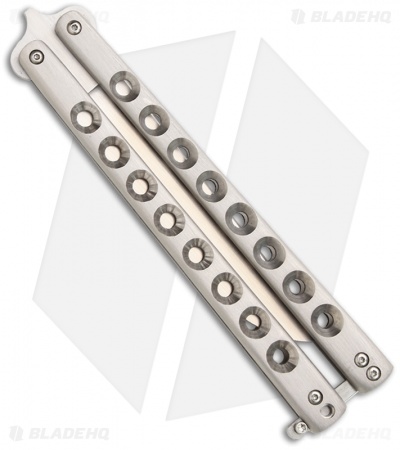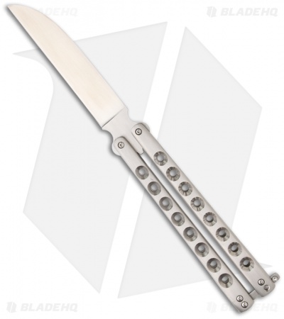This McAhron butterfly knife has 3/16 inch thick skeletonized titanium handles. The pivots have silicon bronze bushings and washers that perform well and keep handle play to a minimum. Zen pins are utilized along with 416 stainless spacers and a roller style latch. The Wharncliffe style blade is hand satin finished CPM-3V steel with a flat grind and features a crowned spine and short tang ears.
