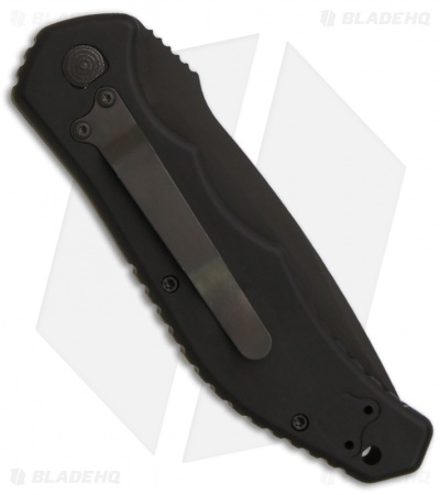 Stylish D. Ralph design. The 18 Xray series features a black DLC coated 154-CM tanto blade with plain edge. The handle is black anodized 6160 aluminum and is contoured to provide a good fit in the hand. The pocket clip is reversible for tip or top down carry. The Xray’s firing button features an integrated safety- it must be slid forward before it can be pressed down so it can’t fire by accident (a very cool design). A very solid knife that would make a great user.This is not a white glove knife, it was made to be used!
