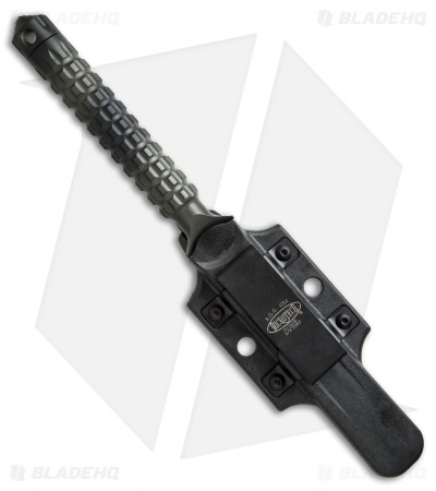 The A.D.O. (Alpha Detachment Operative) is an extraordinary fixed blade knife from Microtech. This ADO features a green camo finished single edge blade (plain) and handle with a waffle-style texture. This knife follows the design of Chris Reeve fixed blades with a hollow handle, accessed by unscrewing the glass breaker tip. It is made from a solid billet of stainless steel. The A.D.O. includes a composite sheath with a spring loaded tab to secure knife and a 2″ steel clip for belt carry.