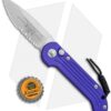 This model has a partially serrated, stonewashed Elmax steel blade and purple anodized handle with bead blast finished hardware.