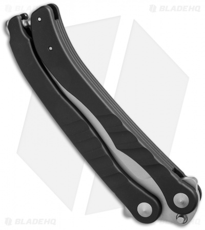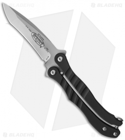 The latest generation of The Metalmark butterfly knife, the production Microtech, distinguishes itself with milled, construction handles, and a spring latch. The blade showcases a Microtech logo, production date, and blade steel markings up front.