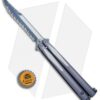 The latest generation of the Tachyon butterfly knife, the production Microtech Tachyon III, distinguishes itself from previous models with milled, single-piece channel construction handles, a spring latch, and a standard pocket clip. The blade showcases a non-sharpened swedge-ground tip and milled grooves with the Microtech logo, production date, and blade steel markings up front.