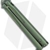 The latest generation of the Tachyon butterfly knife, the production Microtech Tachyon III, distinguishes itself from previous models with milled, single-piece channel construction handles, a spring latch, and a standard pocket clip. The blade showcases a non-sharpened swedge-ground tip and milled grooves with the Microtech logo, production date, and blade steel markings up front.