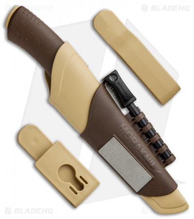 - Brown and tan plastic sheath with ferro rod attached.