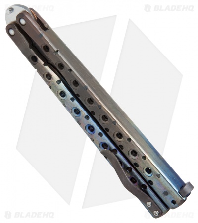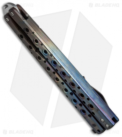 This Custom Deviant butterfly knife from Nathan Dewey has a 154CM stainless steel scandi ground blade and drilled titanium handles with latch and pocket clip. The handles are anodized and contoured with unique finger grooves for added control. Comes with a lifetime warranty from the maker (excludes wear from use). Includes signed and dated certificate of authenticity.