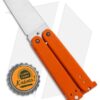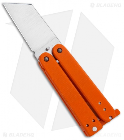 This Gremlin balisong was made for Blade HQ by Nathan Dewey. It has a satin finished 440C wharncliffe blade with a convex grind. This compact butterfly knife has an orange G-10 handle and latch. Includes a stainless steel pocket clip and spare hardware.
