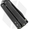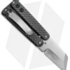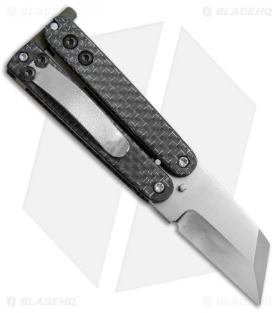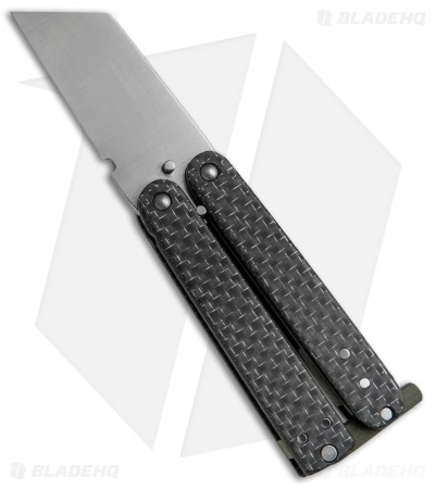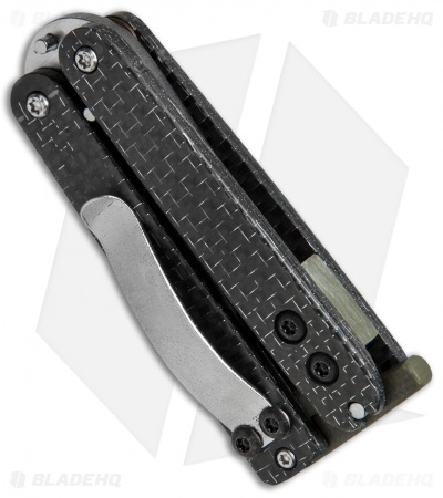 This Gremlin balisong was made for Blade HQ by Nathan Dewey. It has a polished 440C stainless steel wharncliffe blade with an unsharpened swedge. This compact butterfly knife has a silver Lightning Strike Carbon Fiber handle and OD green latch & spacers. Includes a stainless steel pocket clip and spare hardware.
