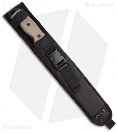 The Ontario Ranger Series RD6 Ready Detachment knife has a 5160 steel blade with a flat ground 8-1/2 inch partially serrated cutting edge. The black texture powder coated full-tang blade is 1/4 inch thick and extends past the black Micarta scales, giving the user a strong pommel and wide hole for lanyard attachment. Includes a MOLLE compatible black nylon sheath with external pocket.