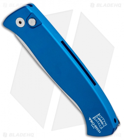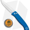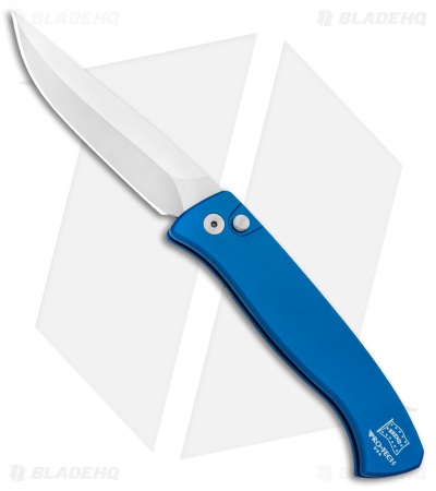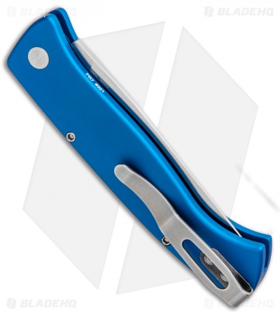 This Brend 2 automatic knife has a satin finished 154-CM steel blade and a blue anodized T6 aluminum body with satin hardware and pocket clip.