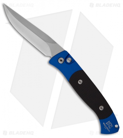 This Brend 2 automatic knife has a satin finished 154-CM steel blade and blue anodized T6 aluminum body with black G-10 inserts, satin hardware and a black pocket clip.