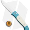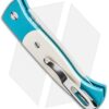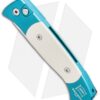 This Tuxedo style Brend 2 automatic knife has a satin finished 154CM steel blade and teal anodized T6 aluminum body with ivory Micarta inserts, satin hardware and a black pocket clip.