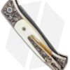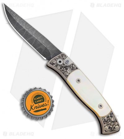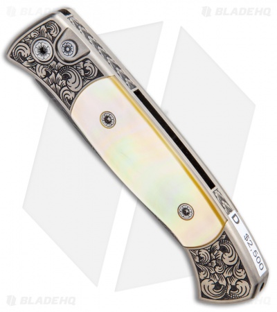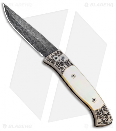 This Ultimate Custom Brend 2 automatic is the best of the best! No detail was overlooked in the creation of this inspired knife. It features a bronzed titanium handle with a hand satin finish and custom hand engraving from Bruce Shaw. The handle sports stunning presentation grade gold lip pearl inlays, custom pivot and push button, and a custom engraved titanium pocket clip. The blade is Herringbone damascus from Vegas Forge. Pictures above are of the actual knife for sale!
