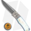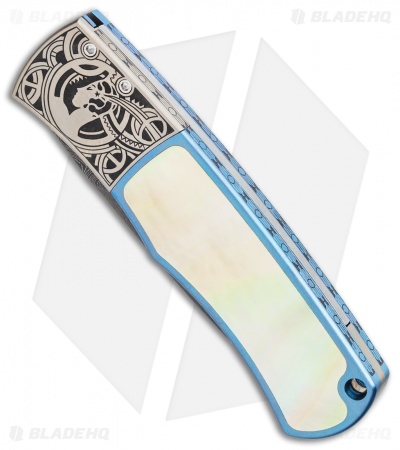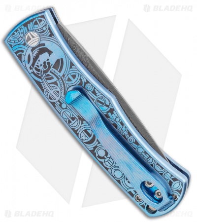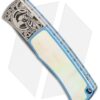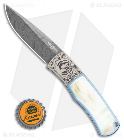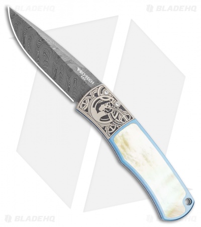 This Ultimate Custom Magic BR-1 knife from Protech has a Chad Nichols “Virus” stainless Damascus steel blade and a hand satin finished and blue anodized titanium frame with gold lip pearl inlays. It features full coverage deluxe Art Deco engraving by Bruce Shaw.