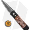 This Custom Godson has a Chad Nichols stainless Damascus blade and black anodized aluminum handle with maple burl inlays and a mosaic pin push button.