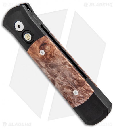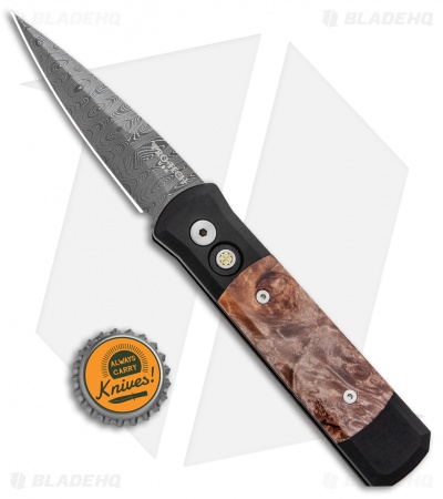 This Custom Godson has a Chad Nichols stainless Damascus blade and black anodized aluminum handle with maple burl inlays and a mosaic pin push button.