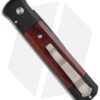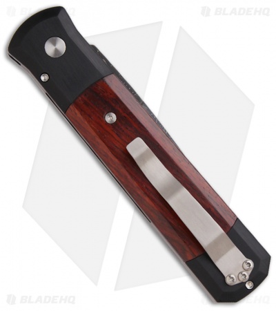 This Custom Godfather knife features a Devin Thomas stainless Damascus blade. The handle is black anodized aluminum with Cocobolo wood inlays and push button insert. Satin finished hardware and a titanium tip-up carry pocket clip.