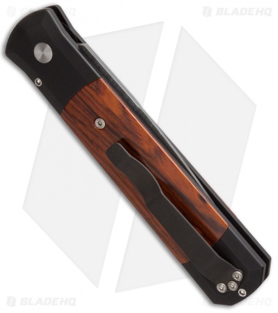 This Custom Godfather knife features a Chad Nichols “Blackout” pattern Damascus steel blade. The handle is black anodized aluminum with Cocobolo wood inlays and a mosaic pin push button insert. Satin finished hardware and a black coated stainless steel pocket clip.