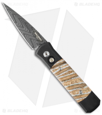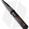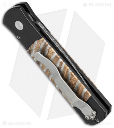 This Custom Damascus Godson features a black anodized aluminum frame with mastodon tooth inlays and a hand satin finished titanium pocket clip. The push button is a mosaic pin inlay. The blade is Devin Thomas “Herringbone” pattern Damascus steel. The action and lockup on this knife is superb, exactly what you’d expect from Pro-Tech.