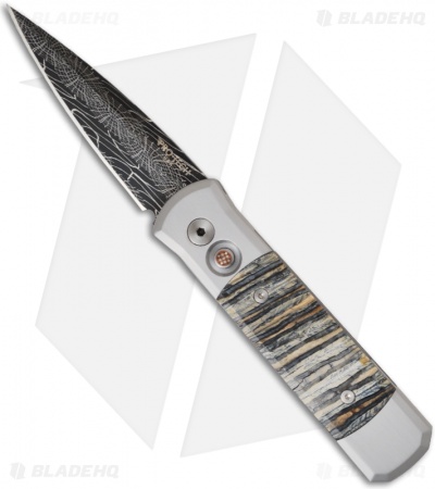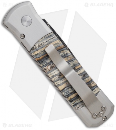 This custom Pro-Tech knife is stunning beyond words! This Godson features a unique Robert Eggerling mosaic Damascus blade. The stainless steel handles are super soled and inlayed with fantastic looking Mastodon tooth on both sides. Includes mosaic firing button and custom titanium pocket clip. Pictures are of the actual knife for sale.