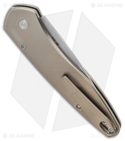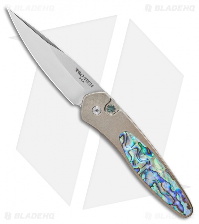 This custom Newport knife has a satin finished S35VN steel blade and a titanium frame with an orange peel finish and a mosaic abalone inlay. Item includes a matching push button insert. Satin hardware and custom titanium pocket clip finish off the design.