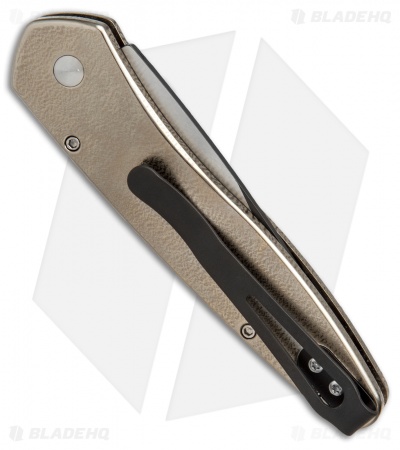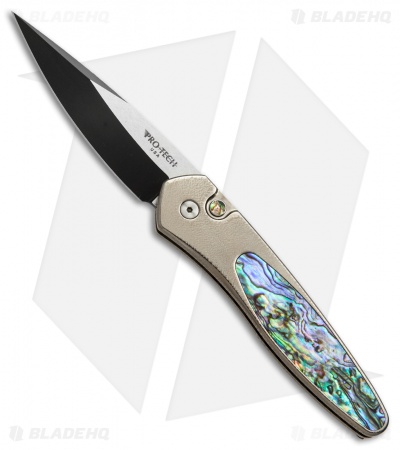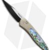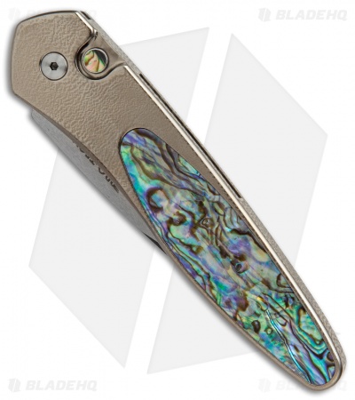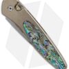 This custom Newport has a two-tone CPM-S35VN blade with satin flats and black finished grinds. Its handle features a bronze anodized, orange peel textured titanium frame with a mosaic abalone inlay and matching push button insert. The knife has a black pocket clip and satin finished hardware.