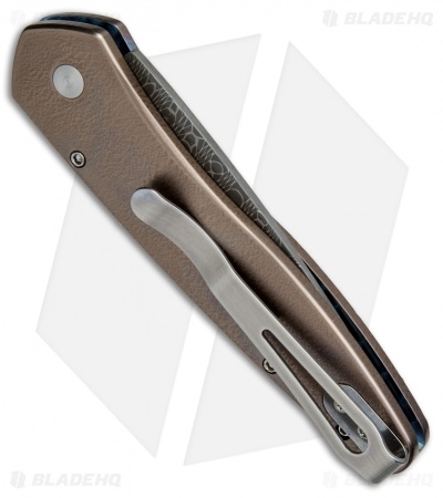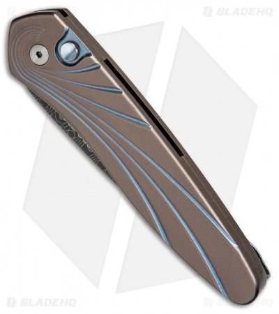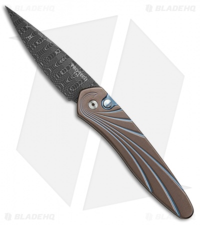 This Custom Newport automatic features a titanium handle with a sculpted wave pattern, orange peel finish, and multi-color anodizing. The blade is hand forged R. Thomas stainless Damascus steel. It has a polished pocket clip and the firing button is outfitted with a black lip pearl insert.