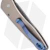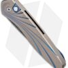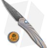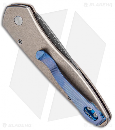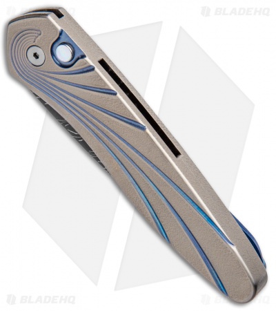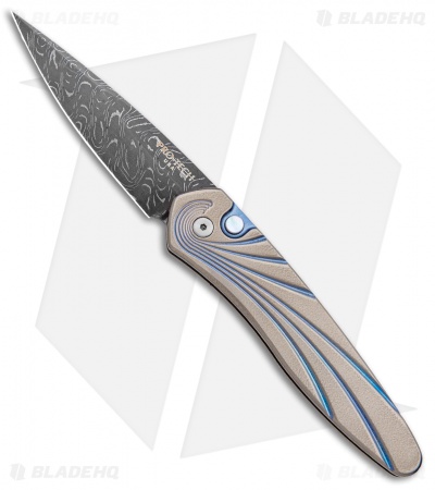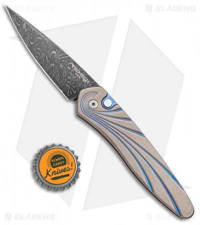 This Custom Newport knife from Pro-Tech features a titanium handle with a blue wave pattern and a mother of pearl inlay. The blade is Chad Nichols Damascus steel.