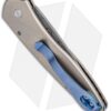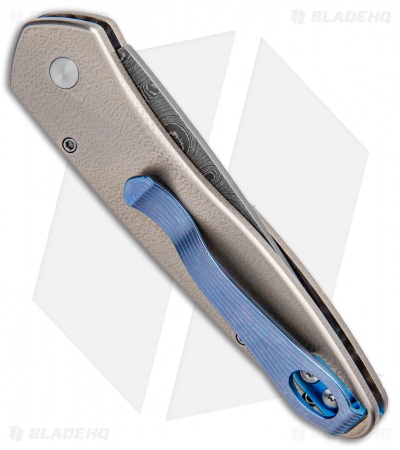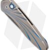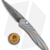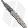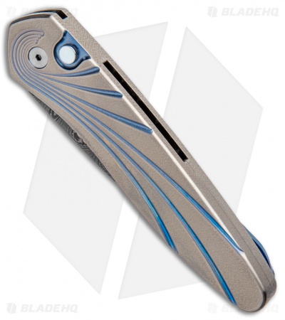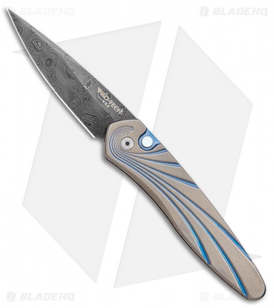 This Custom Newport knife from Pro-Tech features a titanium handle with a blue wave pattern and a mother of pearl inlay. The blade is Chad Nichols Raindrop Damascus steel.