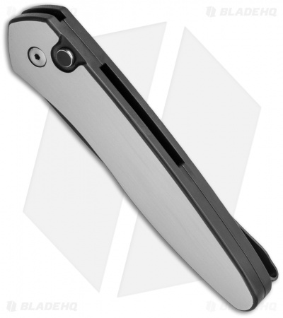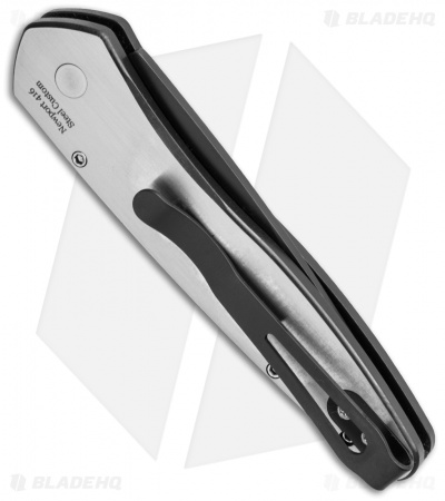 This Steel Custom Newport knife features a two-tone DLC black and satin finished 416 stainless steel handle and DLC black coated S35VN steel blade. It has a black pocket clip and the firing button is outfitted with a black lip pearl insert.